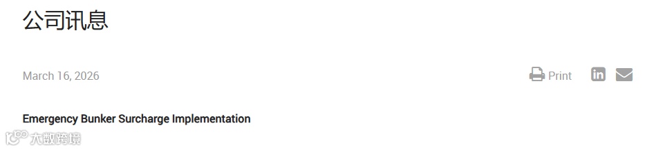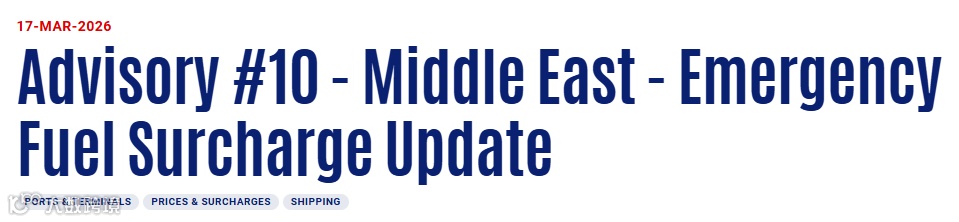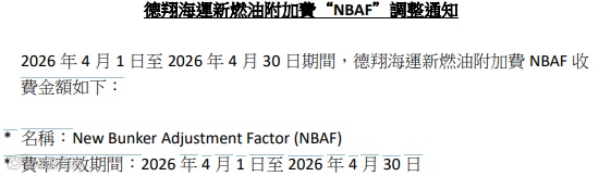 3月16日,德翔海运通告,将在2026年4月1日至2026年4月30日期间,收取新燃油附加费(NBAF),具体收费方案较多,请至德翔海运官网查看详情公告。