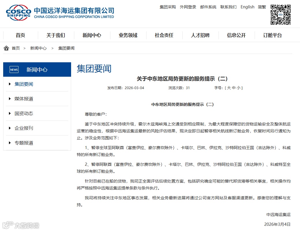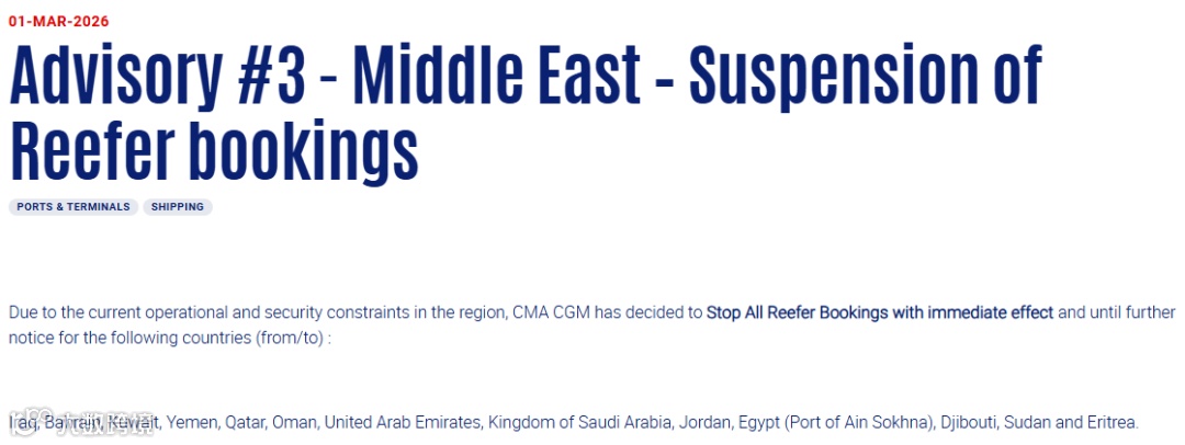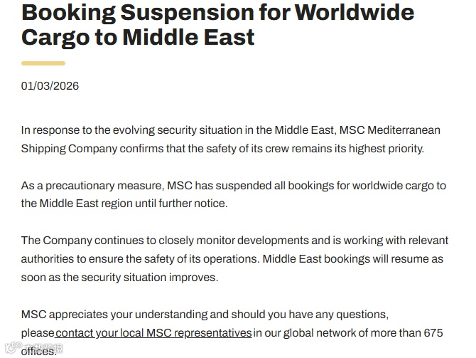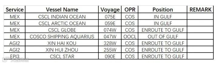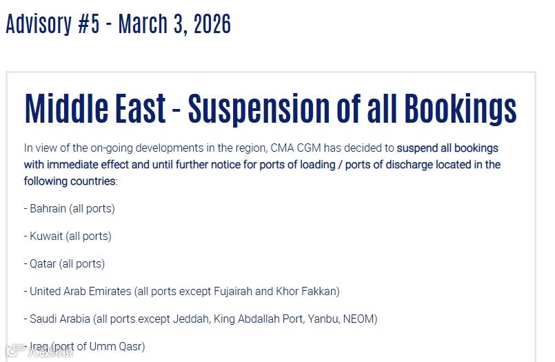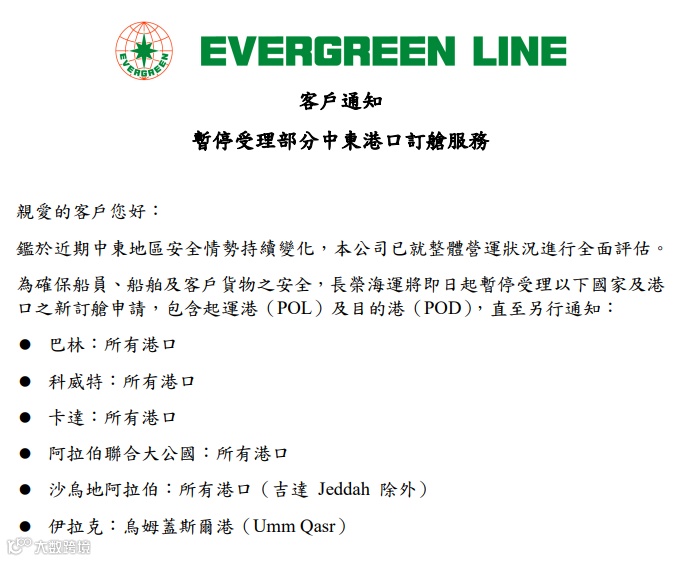 即日起暂停受理巴林、科威特、卡塔尔、阿联酋、沙特阿拉伯(吉达Jeddah除外)、伊拉克乌姆盖斯尔港(Umm Qasr)等国家及港口的新订舱申请,包含起运港及目的港,直至另行通知。