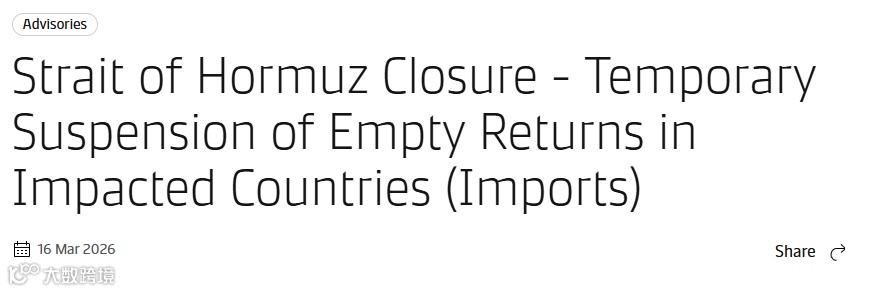 实施临时空箱归还安排,即日起,进入阿联酋、卡塔尔、沙特(朱拜勒)、伊拉克、阿曼(杜库姆) 的现有及新进口货物,空箱不得返回原通常归还地点,仅可送至指定仓库: