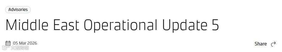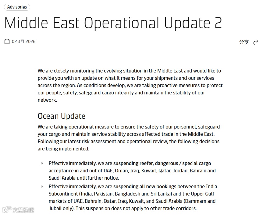 暂停阿联酋(富查伊拉、豪尔费坎除外)、卡塔尔、巴林、伊拉克、沙特阿拉伯王国(吉达除外)、科威特至全球的所有新订舱业务。