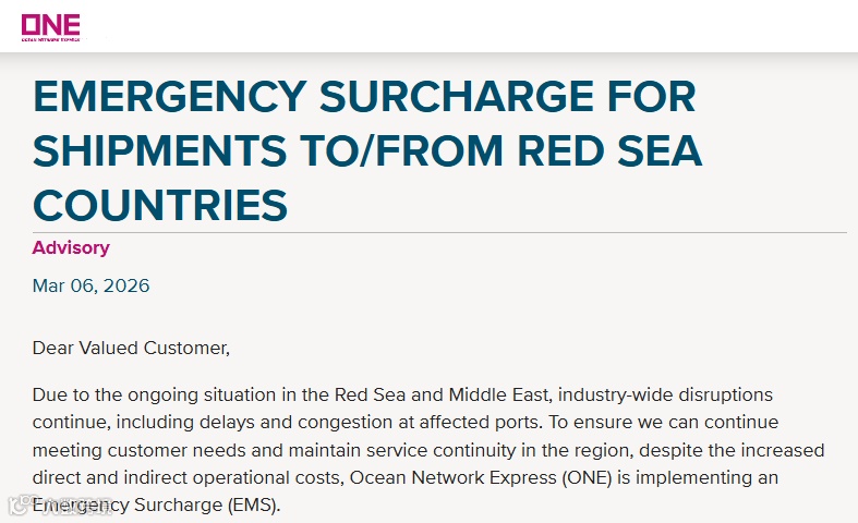 即日起将对所有往返波斯湾及红海受影响国家和港口的进出口货物实施紧急附加费(EMS),直至另行通知。