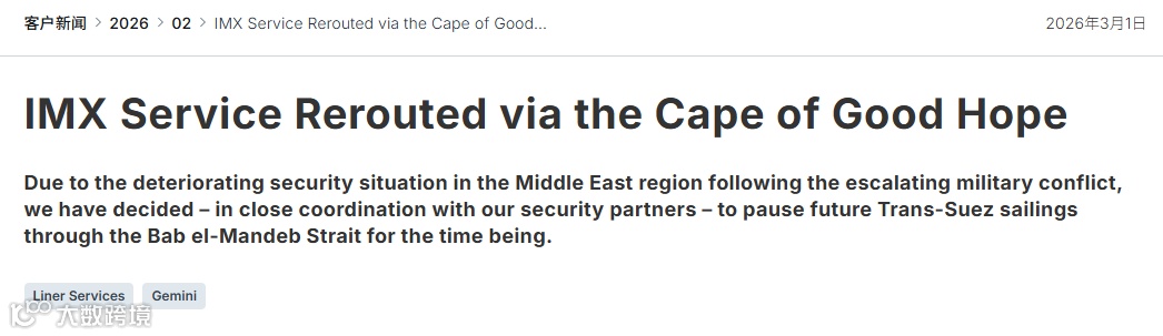 暂时暂停未来经由曼德海峡的跨苏伊士运河航行,IMX航线的所有航次将绕行好望角。
