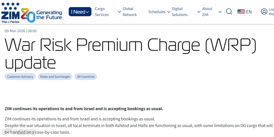 自2026年3月12日起直至另行通知,以星航运针对所有往返以色列货物的战争风险附加费(WRP) :