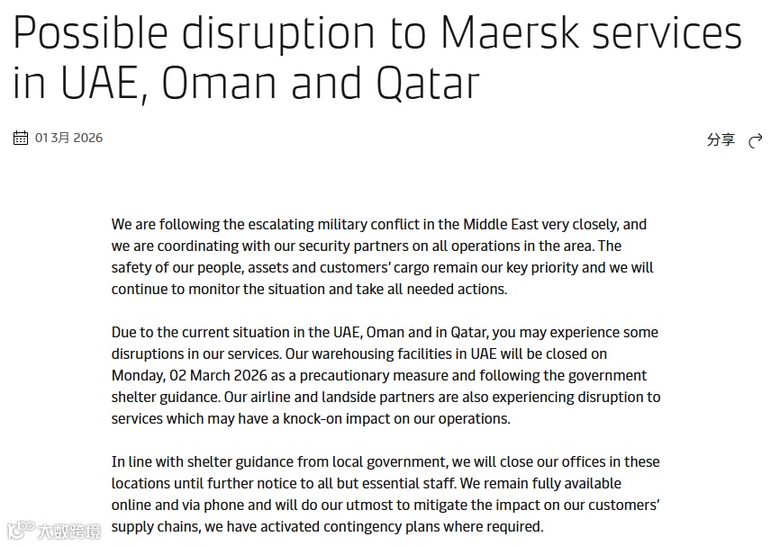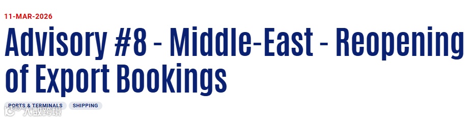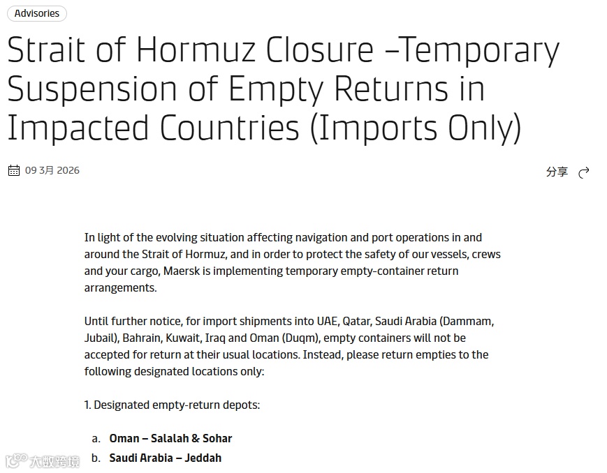 3月17日,马士基更新临时空箱返还安排,自即日起至另行通知前,所有发往阿联酋、卡塔尔、巴林、科威特、沙特阿拉伯(朱拜勒)、伊拉克、阿曼(杜库姆)的现有及新增进口货物,常规空箱返还站点将不再接收空箱。