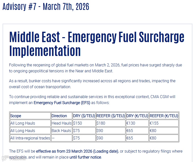 3月17日,达飞官网发布公告,原于3月16日生效的紧急燃油附加费(EFS)金额将进行调整,并自3月27日起执行新标准,具体如下: