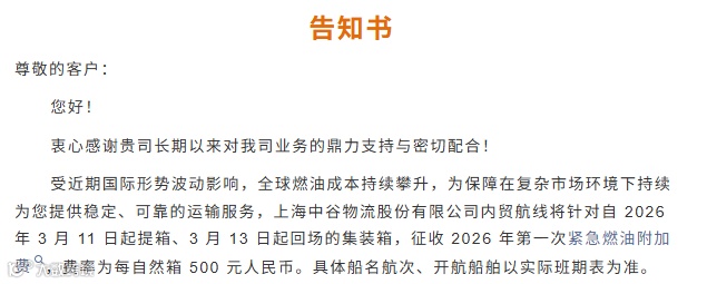 此前,中谷物流发布告知书,针对自2026年3月11日起提箱、3月13日起回场的集装箱,征收2026年第一次紧急燃油附加费,费率为每自然箱500元人民币。