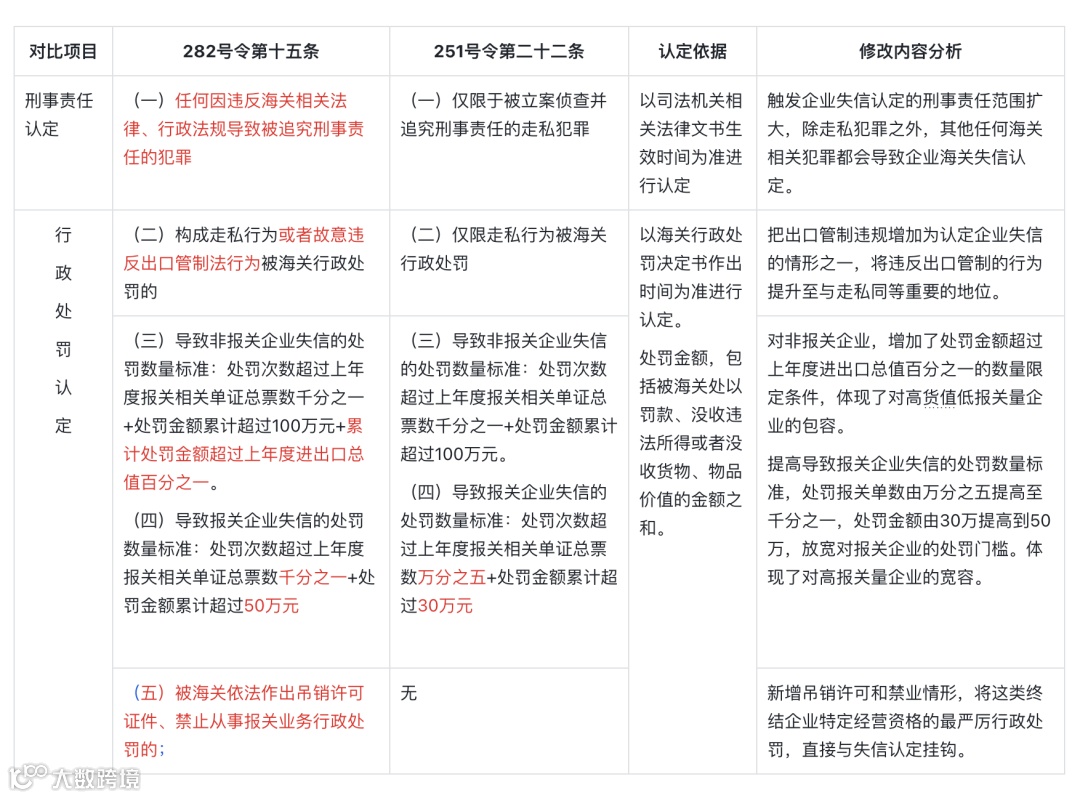 相较于旧办法失信企业8项认定标准,282号令第十五条修订增加到了10项认定标准,并且在标准内容上也进行了整合和优化。新、旧办法内容的主要差异对比如下: