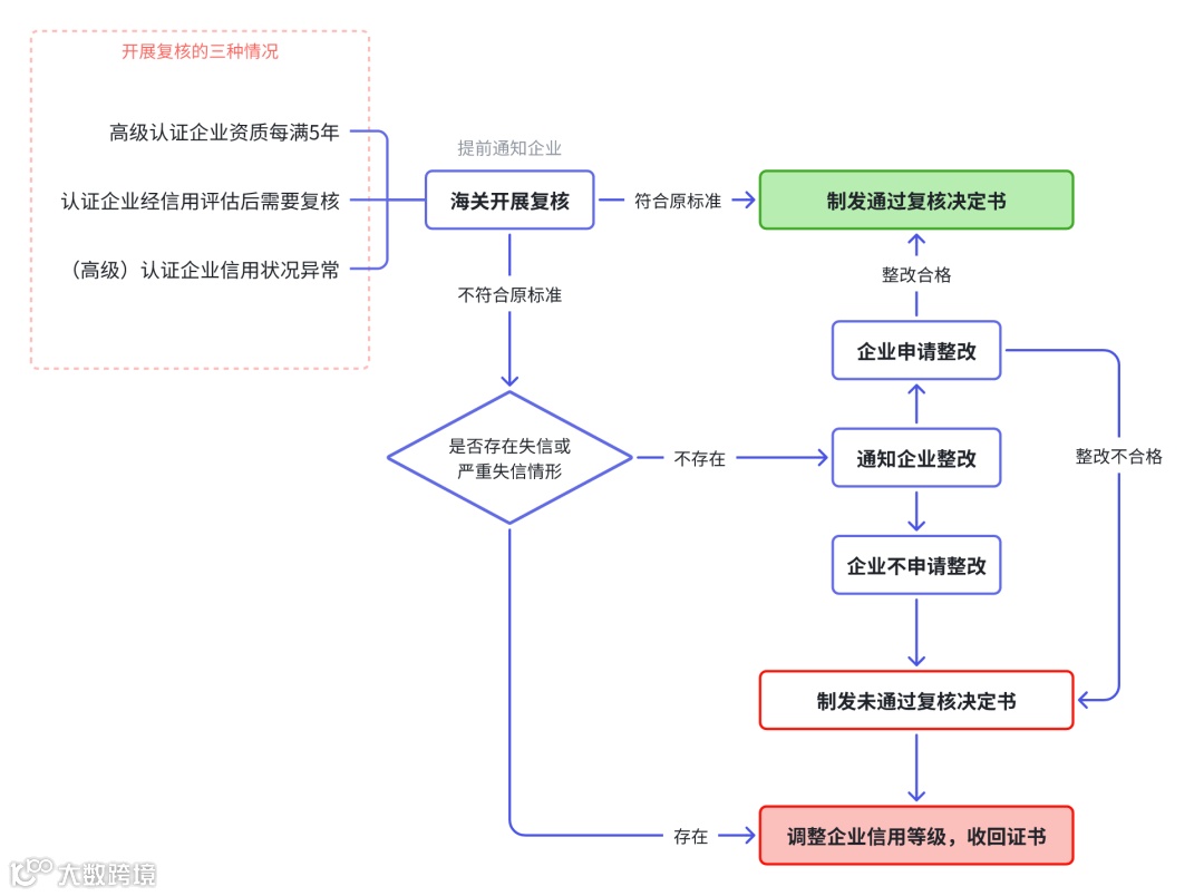 (高级)企业认证是一个需要维持信用管理的动态过程,企业在首次认证通过后应当建立内审和合规机制,维持信用状态始终符合或高于所在信用等级的认证标准,以应对海关定期或不定期的复核。282号令第二十四条规定,根据复核结果,会有三种处理方式:符合原等级标准,制发通过复核决定书;具备失信或严重失信情形的,调整企业信用等级,收回高级认证企业或认证企业证书;不符合原等级标准,但是不具备失信和严重失信情形的,书面通知企业申请整改,根据整改结果做出通过复核或不通过复核的决定,未通过复核的,调整企业信用等级,收回高级认证企业或认证企业证书。新办法给予那些不存在失信或严重失信情形、仅是不符合认证标准的企业整改机会,增加了对未失信企业的执法宽容度。企业信用等级复核流程总结如下: