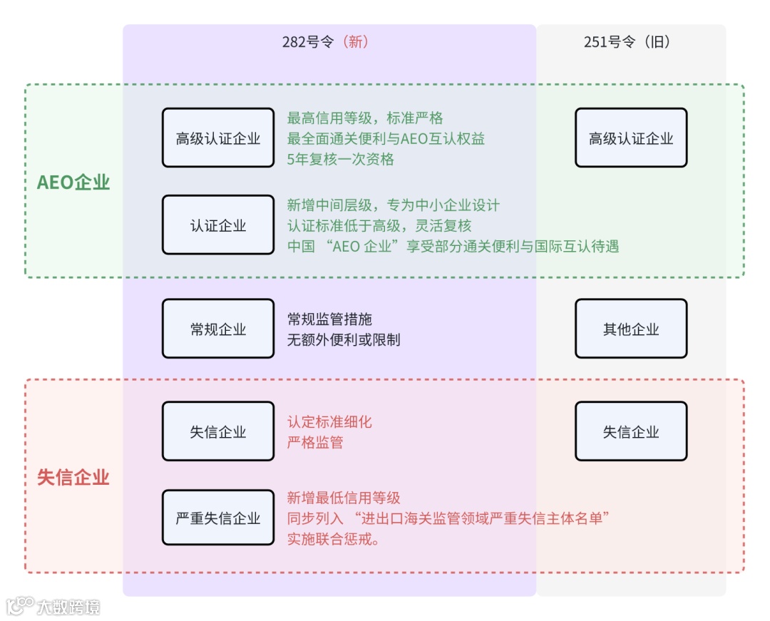 251号令第四条采用三级分类体系,即高级认证企业、失信企业和其他企业,282号令第四条调整为五级分类体系,即高级认证企业、认证企业、常规企业、失信企业、严重失信企业,形成 “梯度化信用管理体系”。这种调整为企业提供了更多的信用提升通道,特别是新增的 “认证企业” 层级,专门为广大中小进出口企业提供适配的信用提升通道(搜狐网:《海关 282 号令 4 月实施 企业信用五级管理体系落地》)。