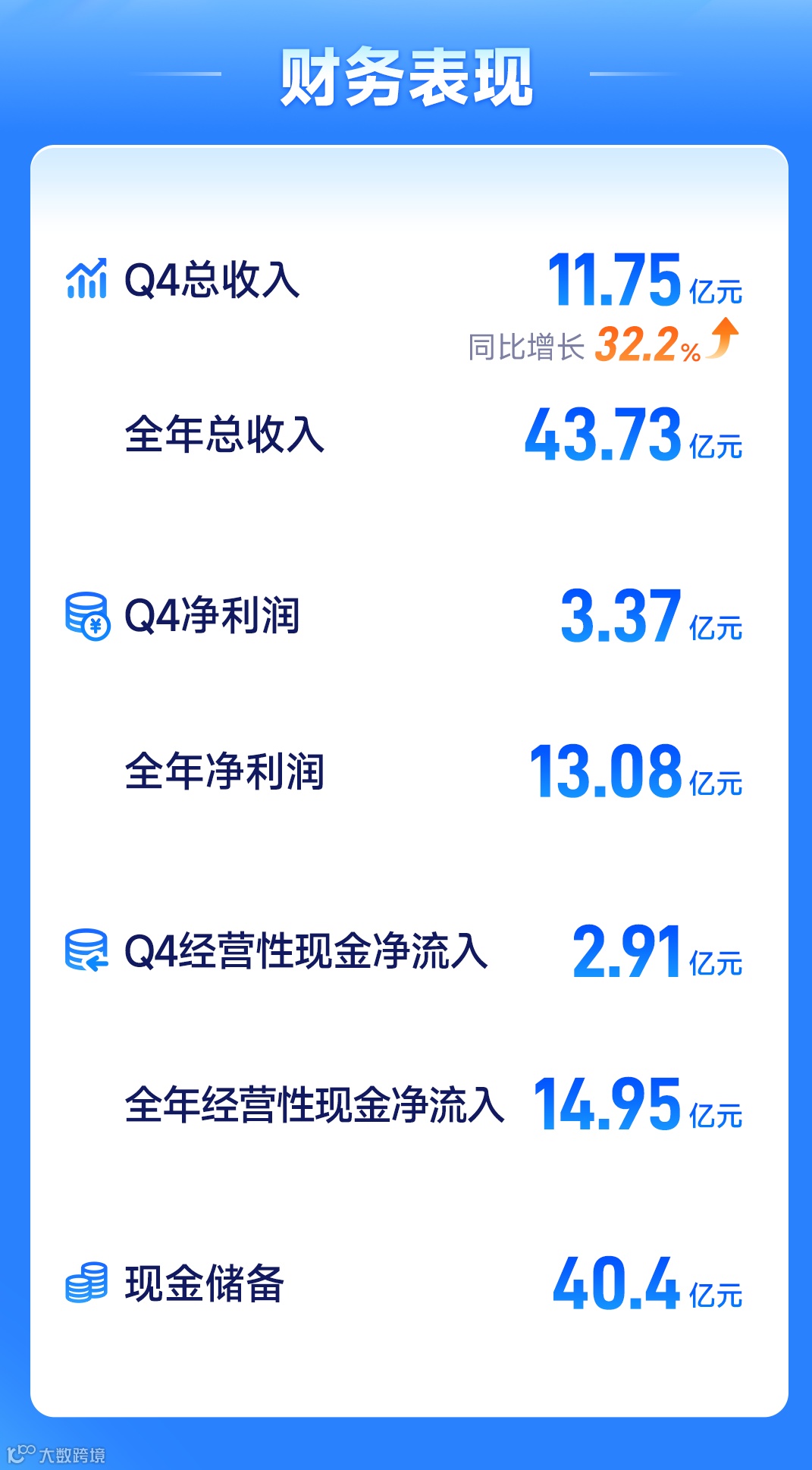 财报数据显示,元保2025年营收43.73亿元(人民币,下同),同比增长33.1%;净利润13.08亿元。截至2025年12月31日,元保现金储备达40.4亿元。其中,2025年第四季度元保营收11.75亿元,同比增长32.2%,净利润3.37亿元。