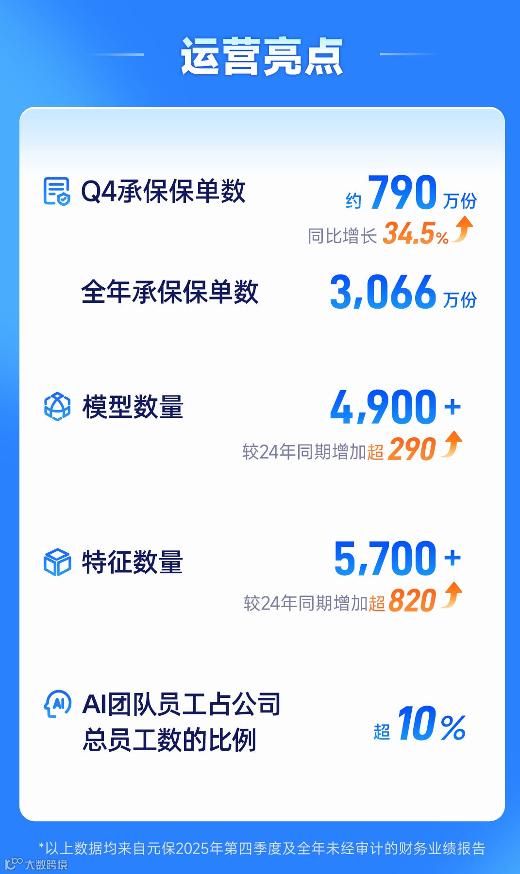 亮眼业绩背后,是元保在数据模型与技术能力上的持续深耕,消费者全周期服务引擎能力不断强化。截至2025年12月31日,元保模型网络已扩充至超过4900个模型和5700个特征,较上年同期分别新增超290个模型和820个特征。在AI技术深度赋能下,元保运营效率与业务规模同步提升,全年新保单数量达3066万份,同比增长36.7%,第四季度新保单数量约790万份,同比增长34.5%。