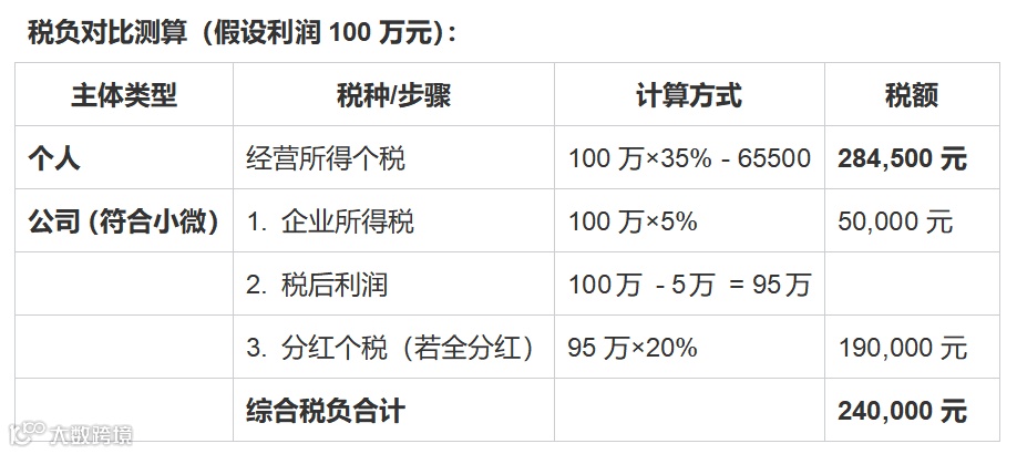 结论显而易见:当利润达到一定规模(例如超过50万),注册为有限责任公司并申请小微企业认定,其综合税负(24%)明显低于个人经营所得的最高档税率(35%)。这还没考虑公司其他成本费用抵扣更规范的优势。