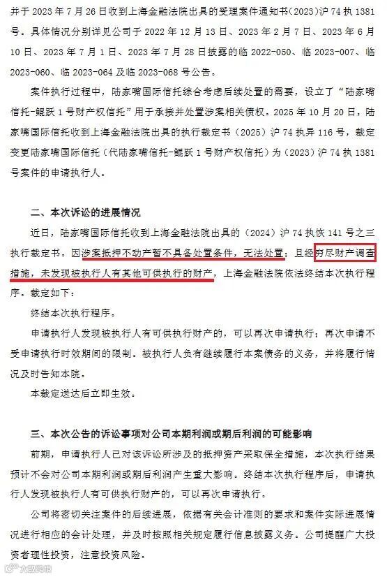 近日,控股子公司陆家嘴信托收到上海金融法院出具的执行裁定书,因涉案抵押不动产暂不具备处置条件,无法处置;且经穷尽财产调查措施,未发现被执行人有其他可供执行的财产,上海金融法院依法终结本次执行程序。