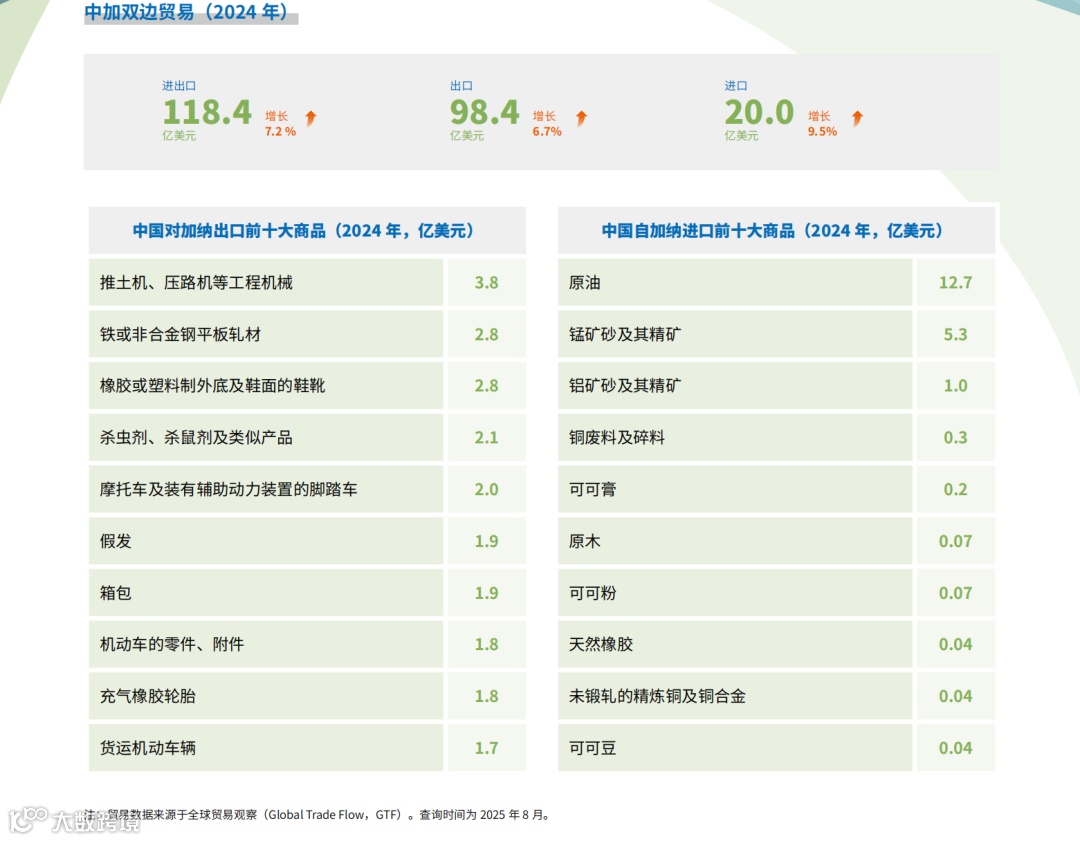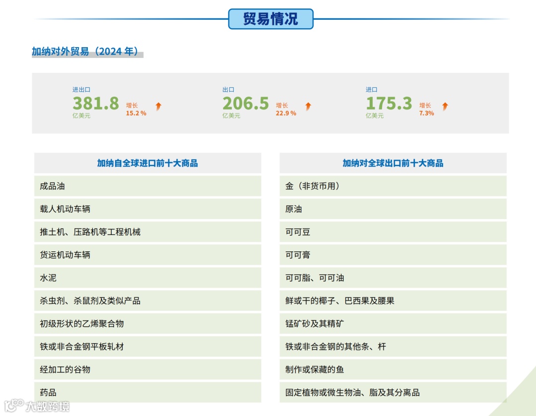 中国稳居加纳第一大贸易伙伴:2024 年双边贸易 118.4 亿美元 (+7.2%);中国对加纳出口 98.4 亿美元 (+6.7%),自加纳进口 20.0 亿美元 (+9.5%)(来源:全球贸易观察 GTF,2025 年 8 月)。