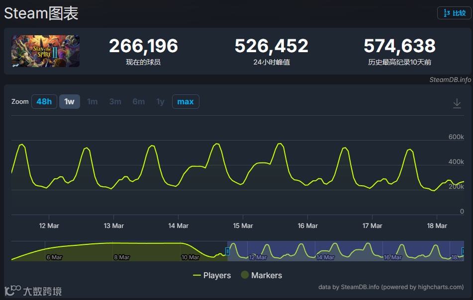 3月6日,知名卡牌肉鸽游戏《杀戮尖塔》推出了续作《杀戮尖塔2》,游戏一经上线就火爆全球,Steam最高同时在线人数超过57万,据游戏开发商Mega Crit透露,虽然《杀戮尖塔2》只是EA版,但游戏的首周销量依旧突破300万份。