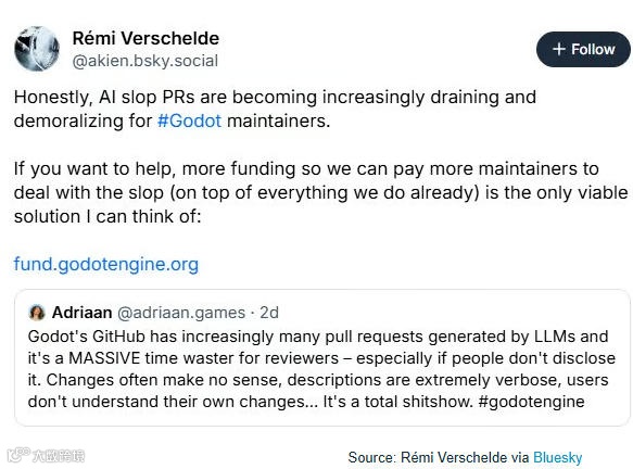 另外就是Godot的开源特性以及低上手门槛,在如今的AI时代可能会出现一些问题,比如前段时间Godot引擎首席维护者Rémi Verschelde就吐槽,GitHub上有太多利用AI生成的“垃圾代码”,对开源社区的审核工作造成了困扰。