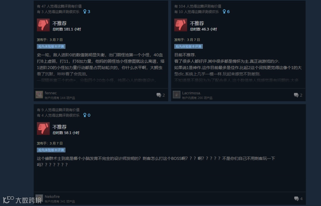为数不多的差评中,主要还是吐槽游戏数值设计,以及与前作差别不大