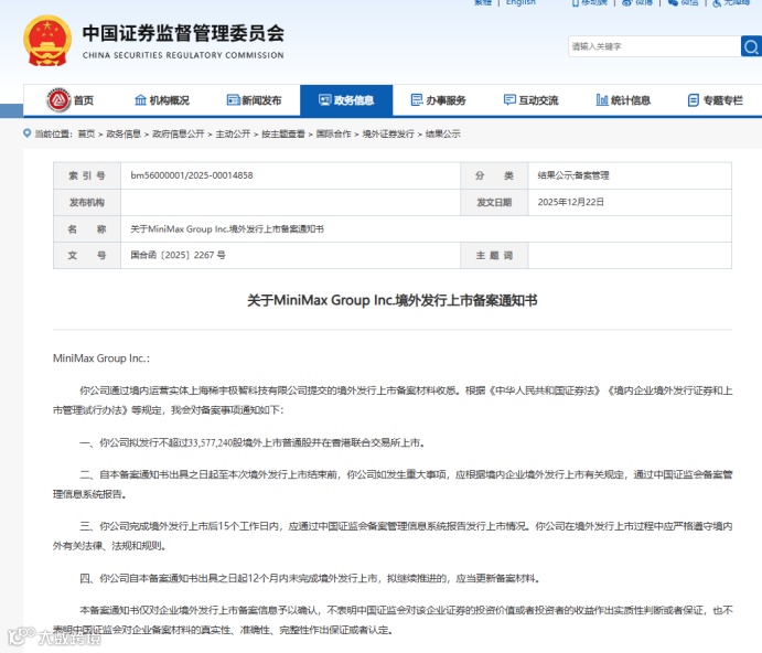 证监会备案通知书显示,MiniMax Group Inc. 是通过境内运营实体上海稀宇极智科技有限公司提交境外发行上市备案。