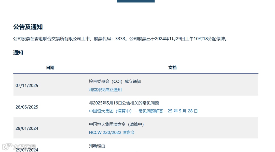 中国恒大作为在港股上市的离岸控股平台,目前仍处于清盘程序,股份自2024 年 1 月 29 日起停牌。
