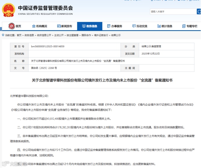 证监会备案通知书显示,北京智谱华章科技股份有限公司拟发行境外上市普通股并在港交所上市,同时办理境内未上市股份“全流通”。