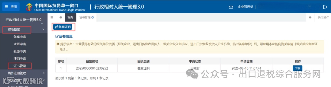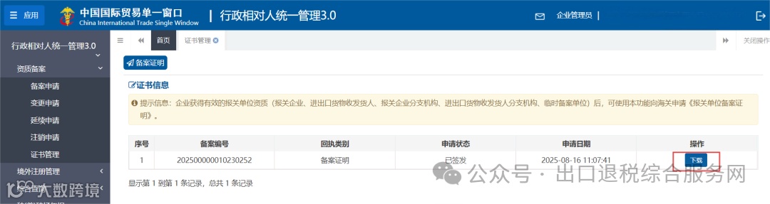 点击“确认”后,等待系统反馈,再点击“下载”即可得到新版《报关单位备案证明》。