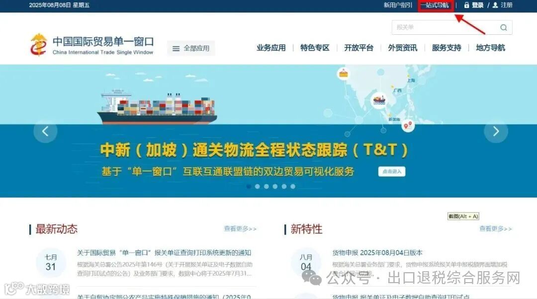 打开浏览器,在地址栏输入中国国际贸易单一窗口网址进入首页:www.singlewindow.cn,点击右上方“一站式导航”,点击“报关单位备案”进入。