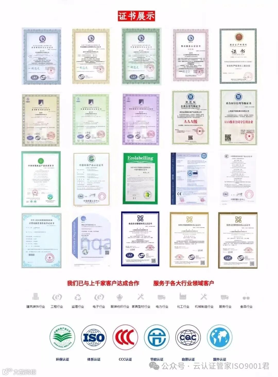 ISO三体系认证覆盖全行业,包括制造业、建筑业、食品业、互联网及服务业等。目前全球已有数十万家企业、政府机构及社会组织获得第三方认证。通过专业机构认证,已成为企业进入市场、赢得客户信任的基础资质。