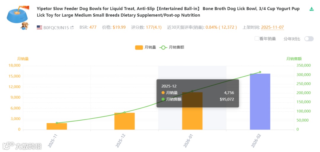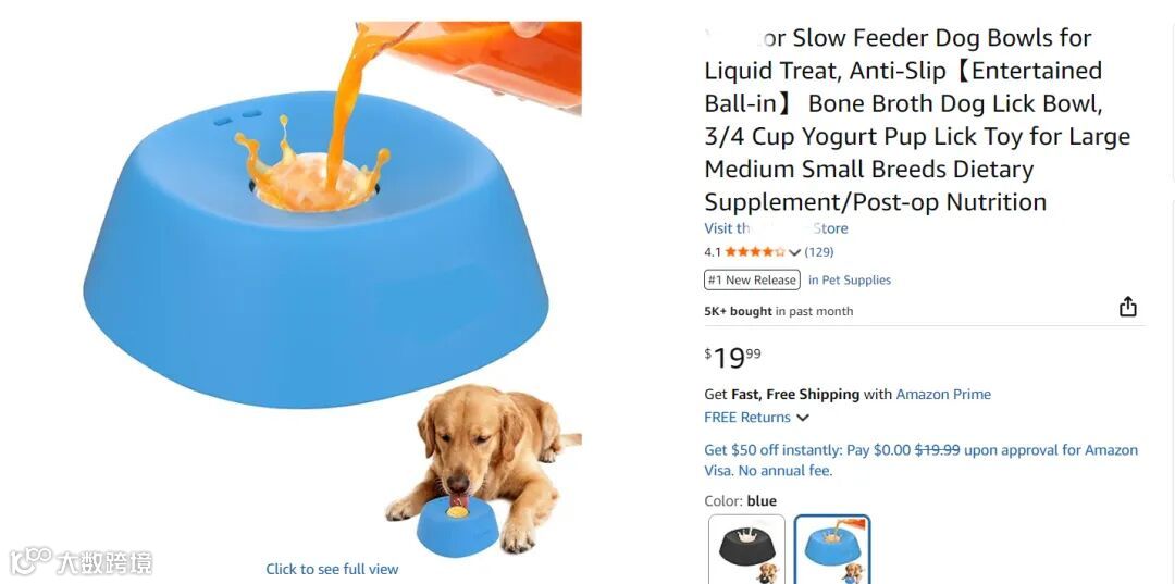 以亚马逊美国站为例,下图所示产品为一种“宠物流食碗”,review:100+,客单价19.99美金,日销量400+,月销售额24w+美元