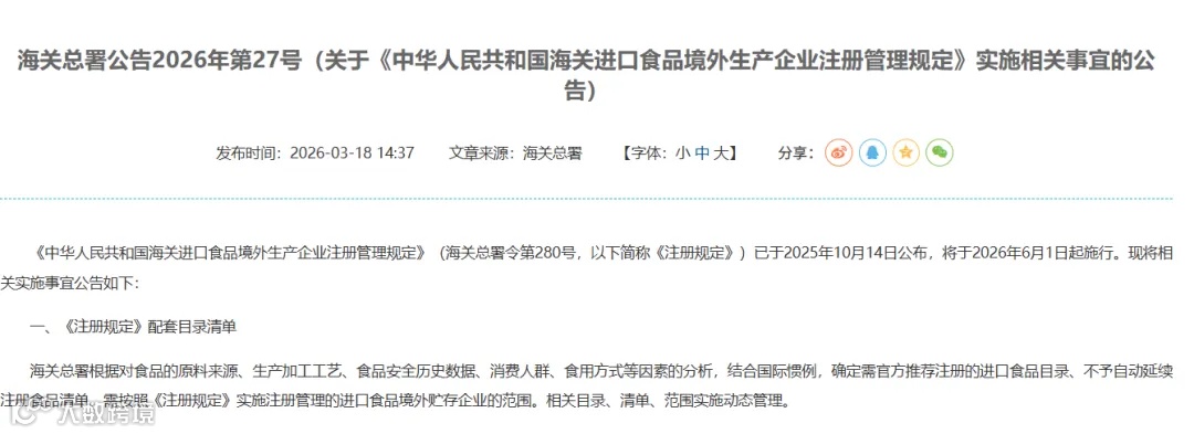 此前,《中华人民共和国海关进口食品境外生产企业注册管理规定》(海关总署令第280号)已发布,但未同步公布需官方推荐注册的进口食品类目。2026年3月19日,海关总署发布《关于〈中华人民共和国海关进口食品境外生产企业注册管理规定〉实施相关事宜的公告》(2026年第27号),正式更新配套目录,明确保健食品仍须通过官方推荐方式完成注册。