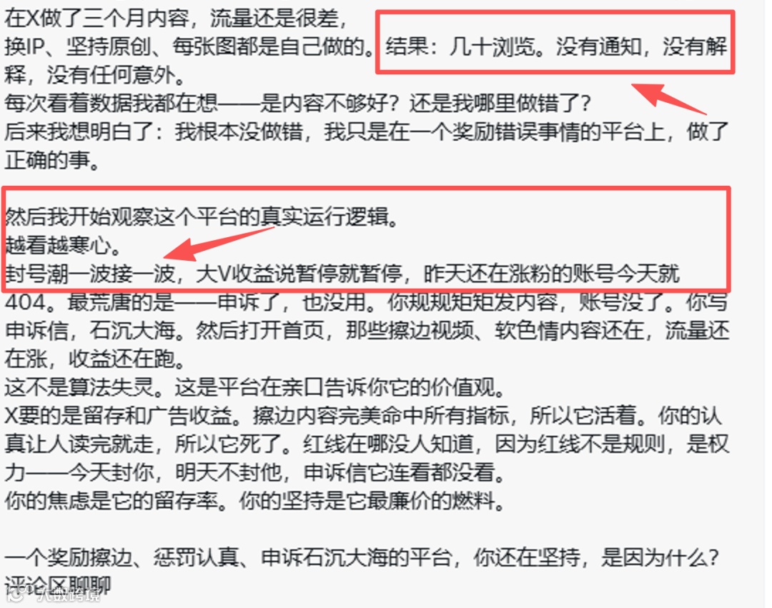 更深远的影响在于:长期依赖“水洗”已严重损害中国创作者在海外平台的公信力。从YouTube到TikTok,再到X平台,重复的短视行为正将“中国创作者”标签推向负面认知边缘——信用积累需数代人,崩塌只需几批“羊毛党”。