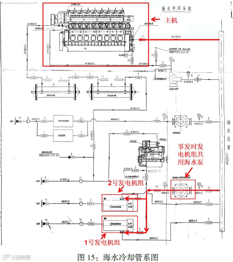 1700时,大管轮发现主机滑油温度偏高(77~78℃),判断为冷却海水量不足;实际原因为右舷低位海底门滤器堵塞,导致主机及发电柴油机冷却失效,两台发电机组因冷却淡水温度过高触发高温保护停车。