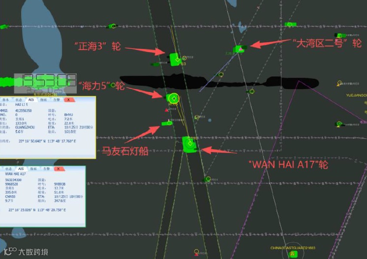2025年10月25日19时54分32秒,广州港主航道马友石灯船东北侧水域发生一起重大海上碰撞事故。散货船“海力5”轮与新加坡籍集装箱船“WAN HAI A17”轮相撞,“海力5”轮随即沉没,15名船员落水,2人遇难;“WAN HAI A17”轮球鼻艏严重破损变形。广东海事局提级调查后发布事故调查报告。