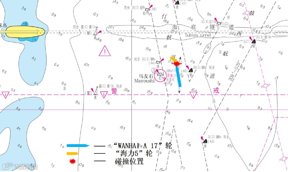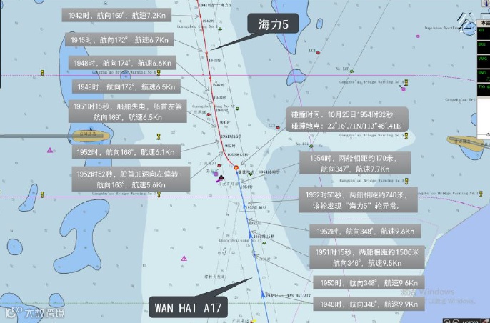 1953至1954时,“WAN HAI A17”轮指挥混乱:船长先后下令右转、左转、左满舵,均遭引航员反对;其后引航员下令右舵、停车,船长执行后又下“左满舵”指令,期间舵向反复切换;引航员多次向交管中心报告“海力5”轮失控横越船头。1954时,该轮停车。