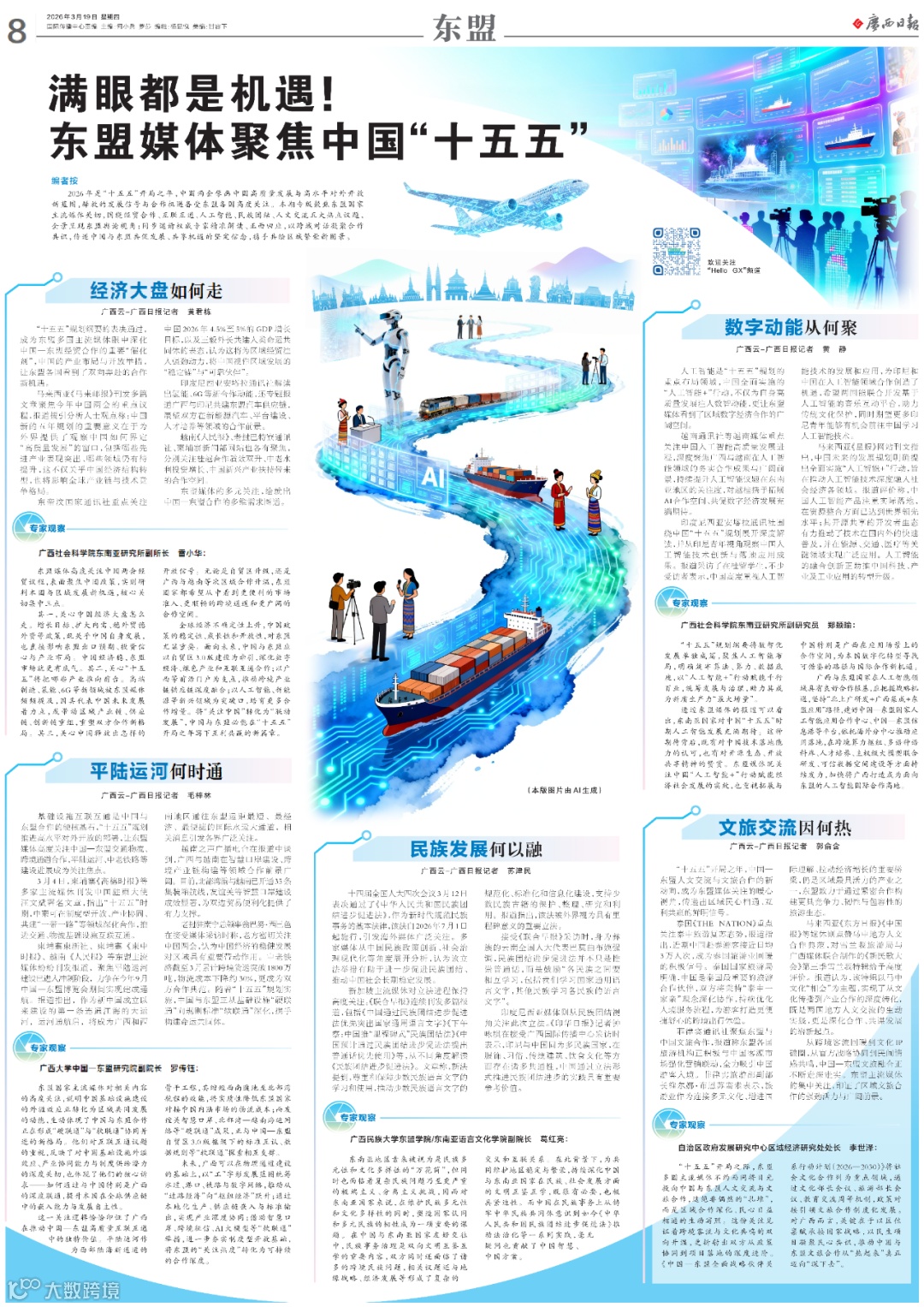 2026年是“十五五”规划开局之年。中国两会擘画高质量发展与高水平对外开放新蓝图,释放的发展信号与合作机遇备受东盟各国关注。本期聚焦东盟主流媒体关切,围绕经贸合作、互联互通、人工智能、民族团结、人文交流五大议题,呈现区域舆论视角;同步邀请权威专家解读,推动跨域对话,凝聚合作共识,传递中国与东盟共促发展、共享机遇的坚定立场。
