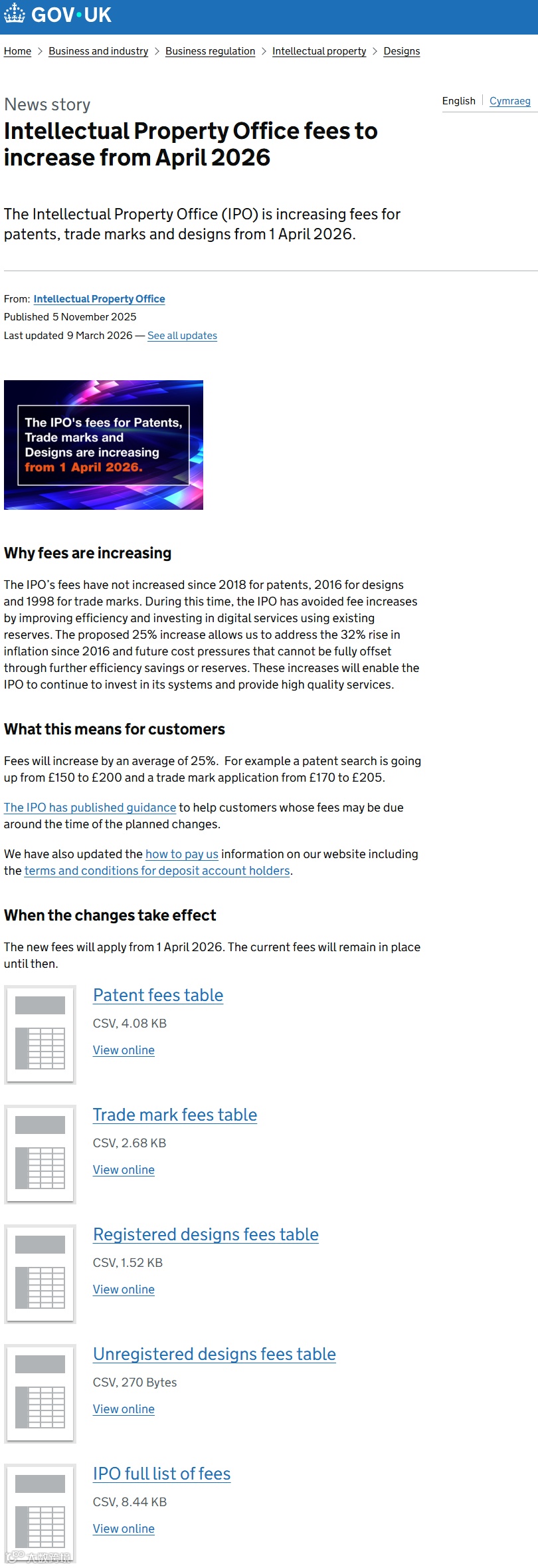 据英国知识产权局(IPO)消息,自2026年4月1日起,该局将对专利、商标及外观设计等相关官费进行全面上调。