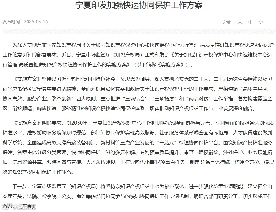 近日,宁夏市场监管厅(知识产权局)正式印发《关于加强知识产权保护中心和快速维权中心运行管理 高