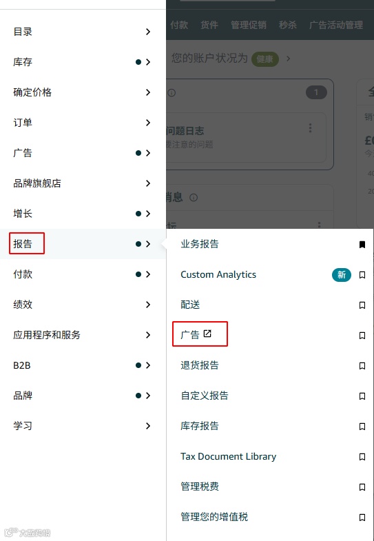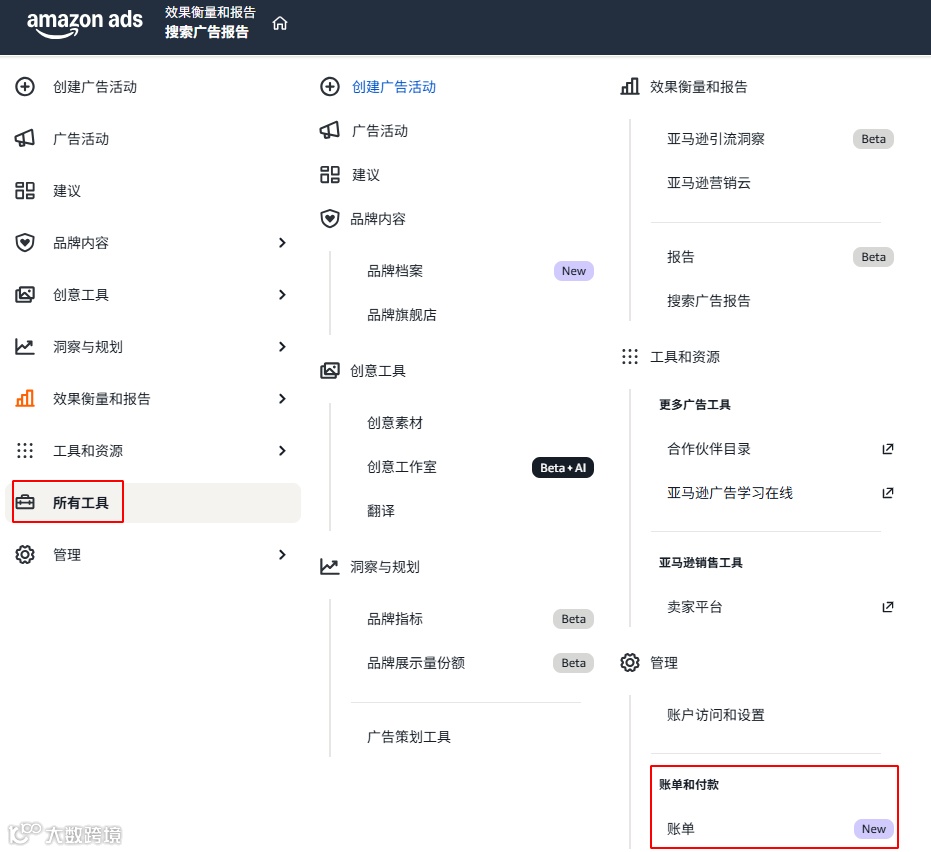 菜单栏 → 报告 → 广告 → 所有工具 → 账单 → 促销