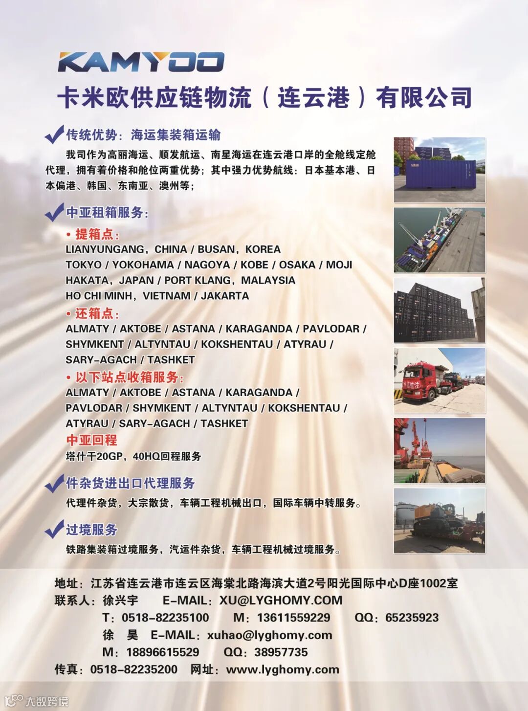 提供铁路集装箱、汽运件杂货、车辆及工程机械的跨境过境运输服务。联系方式