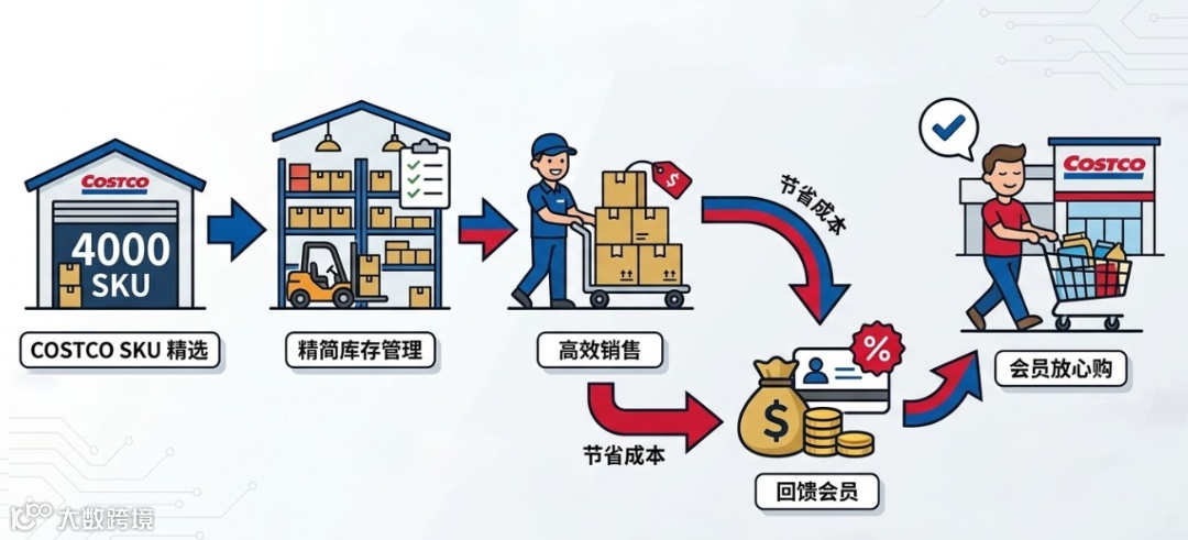 传统超市SKU常超3万个,而Costco单店仅约4,000个SKU。精简SKU不仅优化库存与动销效率,更将成本优势转化为会员价格信任,推动高频次、高确定性复购。