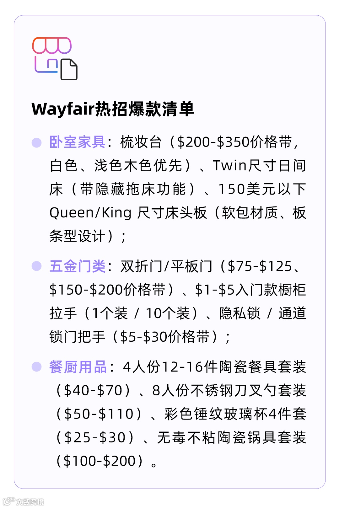 作为北美头部家居电商,Wayfair以“需求早到、供给迟到”的品类特性著称,尤其在卧室家具、五金配件、餐厨用品等领域存在明显尺寸、颜色及价格空白,适合差异化切入。平台客单价高、用户购买力强,对设计感与品质要求持续升级,是优质家居供应商进入北美市场的优选通道。