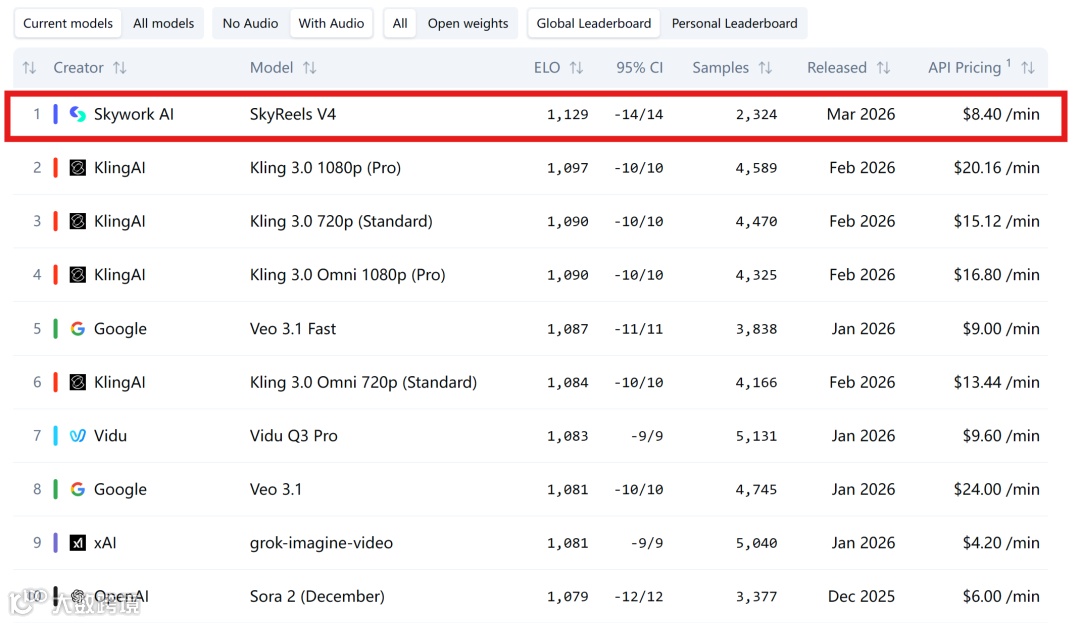 全球视频模型新标杆诞生:天工AI最新发布的SkyReels-V4,正式登顶Artificial Analysis文生视频(含音频)全球排行榜首位,超越Veo 3.1与Sora 2。