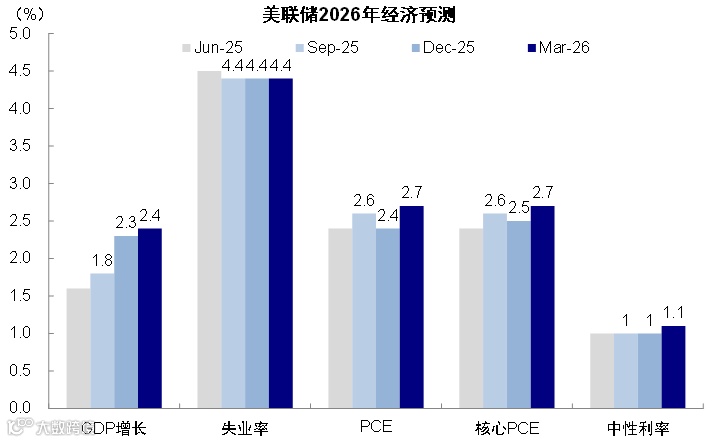 2026年核心PCE通胀预测由2.4%上调至2.7%,反映地缘冲突加剧对中期价格压力的实质性影响。中性利率预测同步上调至1.1%,暗示政策利率长期中枢上移。