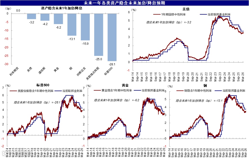 图表:当前资产计入的未来1年降息幅度为:标普500(1.1次)>美联储点阵图(1次)>纳斯达克(0.6次)>铜(0.5次)>黄金(0.2次)≈道琼斯(0.2次)>美债(0.1次)>利率期货(0次)