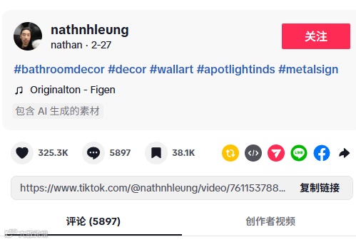 该金属标牌自1月11日上线TikTok美区小店以来,两个月累计售出8606单,GMV达9.2万美元(约合人民币63万元),曾以单周4945单销量跻身美区家居类目TOP6。其中96.22%订单来自视频渠道,爆款AI视频贡献5097单,为绝对销售主力。