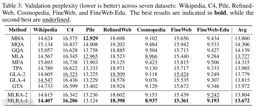 - MLRA-4取得最低平均困惑度13.672,优于MLA(13.727)及其他所有基线;