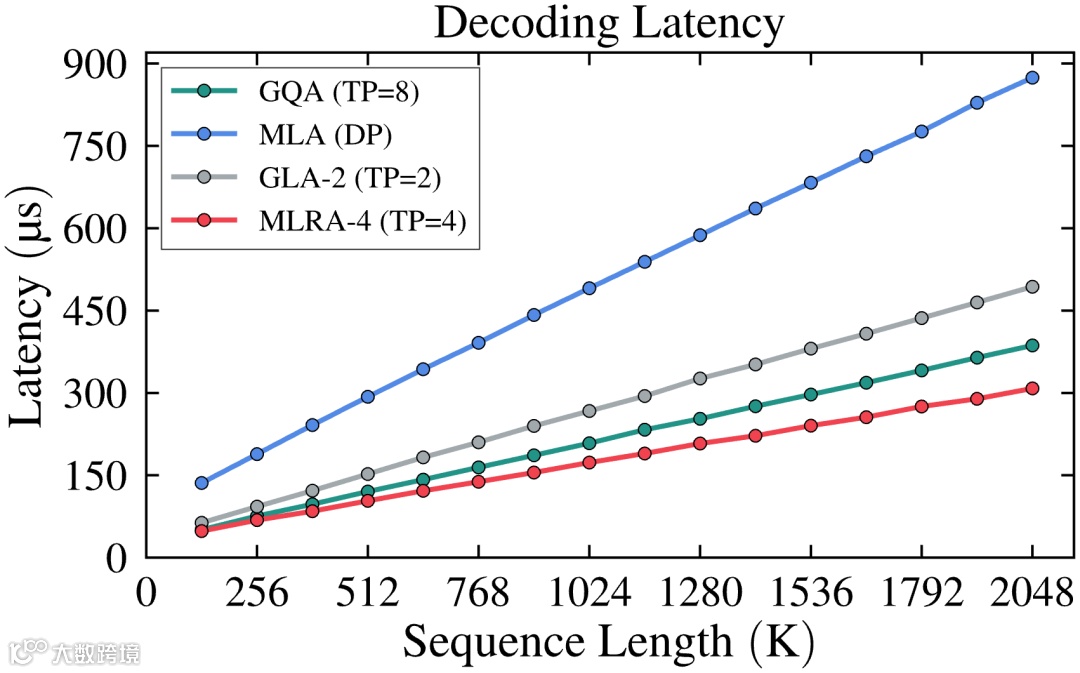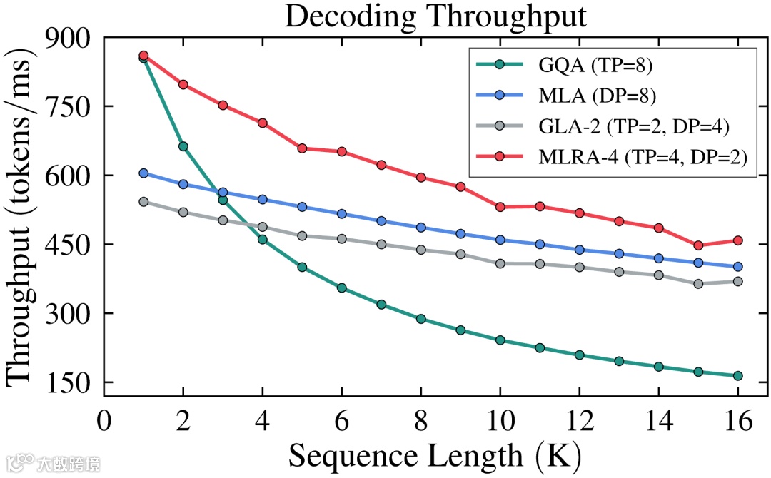 在8块H100 GPU上评估批量解码吞吐量(隐藏层维度7168,参考DeepSeek-V3设置):MLA(DP=8)、GLA-2(TP=2/DP=4)、MLRA-4(TP=4/DP=2)、GQA(TP=8):