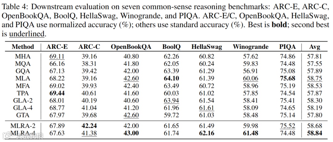 在ARC-E/C、OpenBookQA、BoolQ、HellaSwag、Winogrande、PIQA共7项零样本常识推理任务中,MLRA-4同样取得最高平均准确率,与困惑度结果高度一致。