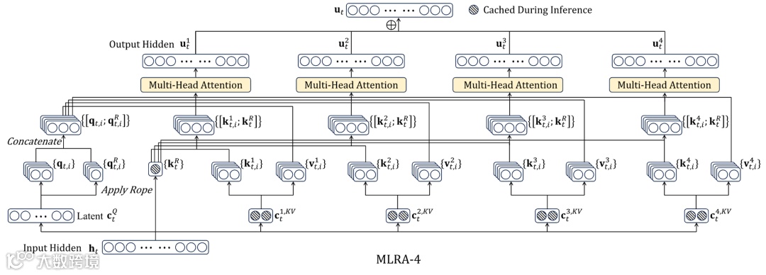 - MLA逻辑:先对四个子块分别投影并求和,再执行Softmax注意力;