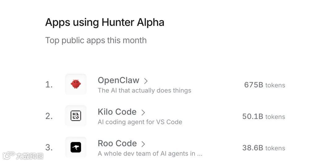 在OpenRouter平台实测中,MiMo-V2-Pro(Hunter Alpha)调用量登顶:OpenClaw贡献675B Token,Kilo Code与Roo Code分别达50.1B和38.6B Token,验证其在生产环境中的高可靠性。