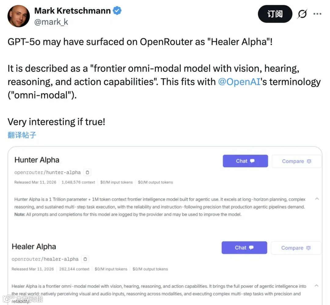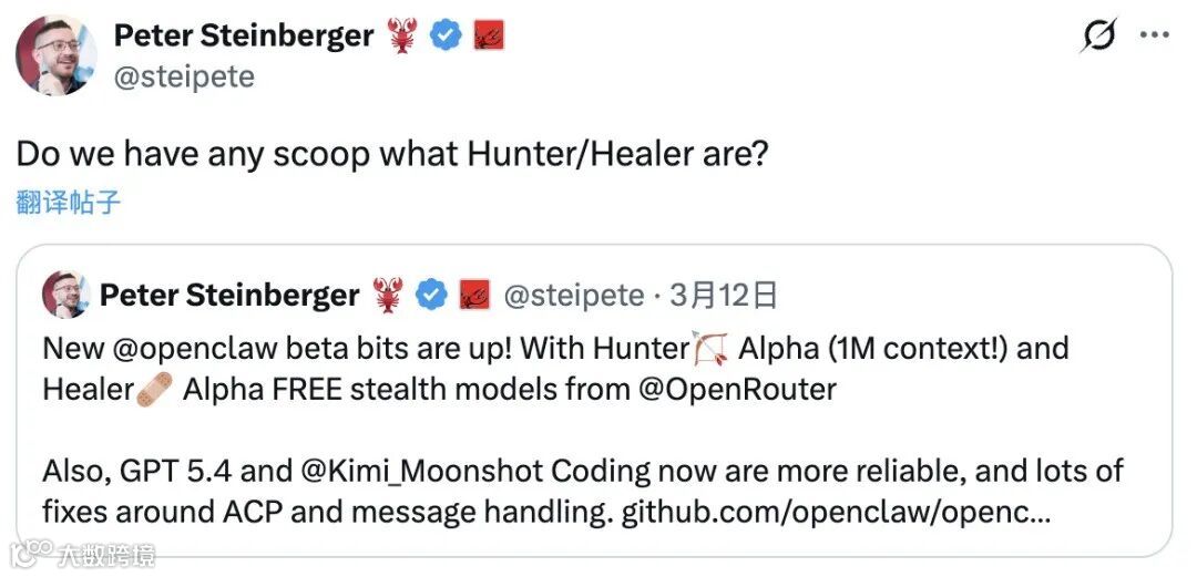 “龙虾之父”Peter Steinberger在X平台发帖询问模型背景,侧面印证其影响力之广。